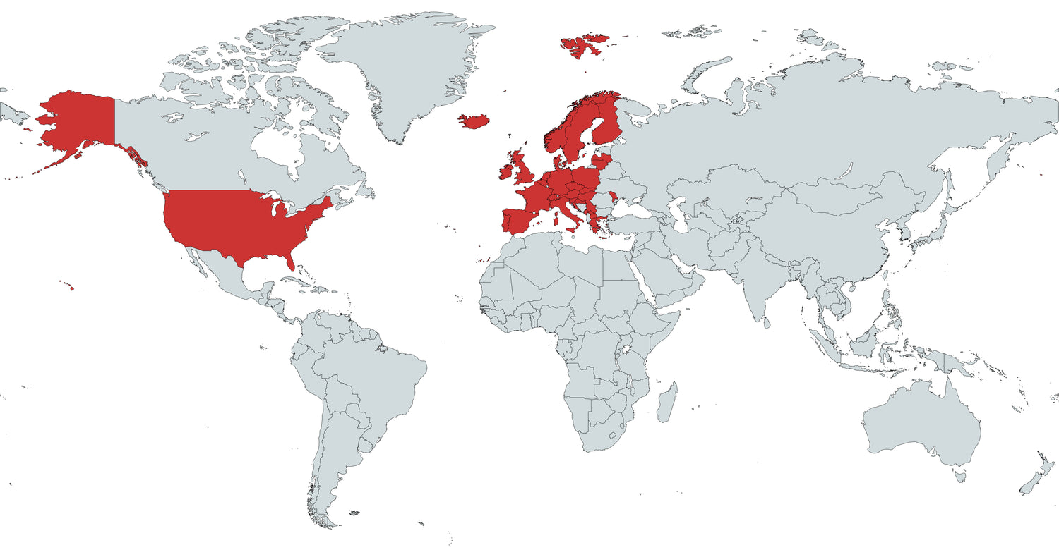 Allemagne, Angleterre, Autriche, Belgique, Croatie, Danemark, Écosse, Espagne, Finlande, France, Grèce, Hongrie, Irlande, Islande, Italie, Kosovo, Lettonie, Lituanie, Macédoine du Nord, Moldavie, Monténégro, Norvège, Pays de Galles, Pays-Bas, Pologne, Portugal, République tchèque, Serbie, Slovaquie, Slovénie, Suède, Suisse, Les États-Unis.